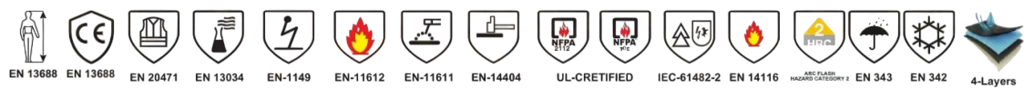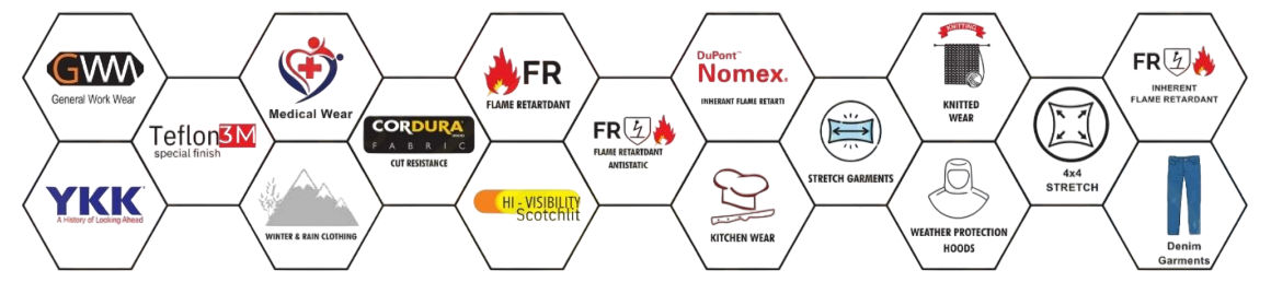 Our Workwear fabrics are carefully selected and engineered to deliver durability, comfort, and protection in demanding environments. We offer a wide range of blends, including 100% cotton, polyester-cotton, and specialized technical fabrics, designed to meet the requirements of industrial, construction, healthcare, and corporate sectors. All fabrics are tested for key performance parameters such as tensile strength, tear resistance, abrasion resistance, dimensional stability, and colorfastness to ensure long-lasting quality. In addition, our fabrics comply with international safety standards including EN ISO 11612 (heat and flame protection), EN ISO 11611 (welding protection), EN ISO 20471 (high-visibility), EN 343 (protection against rain), EN 342 (cold protection), and IEC 61482-2 (arc flash protection). For enhanced wearer safety, we also offer fabrics treated for flame retardancy, water repellency (ISO 4920), anti-static properties (EN 1149) and Inherently flame retardant (EN NFPA 2112).